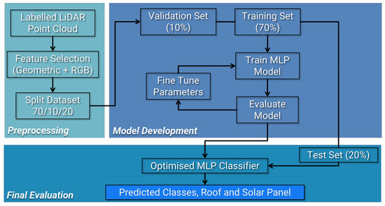 Each point in the LiDAR dataset was manually labelled either as roof (class 0) or solar panel (class 1). The labelled dataset for each site was divided into training (70%), validation (10%), and testing (20%). Splits were performed at the site level so that each site appears in only one of train, validation, or test. The model was trained using spatial coordinates (X, Y, Z), selected geometric features, and RGB values, to identify structural and visual patterns associated with each class. Validation data was used during training to fine-tune model parameters and to avoid overfitting, while the final evaluation was performed using the independent test set. This process is summarised in Figure 5, outlining the classification workflow from feature extraction to model optimisation and prediction.