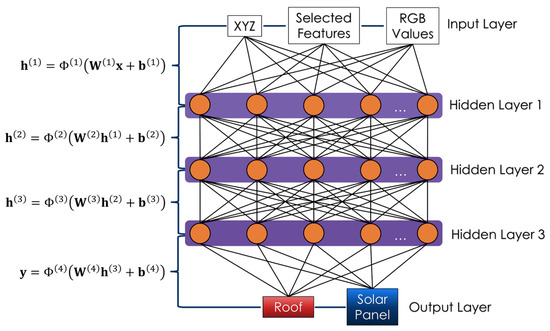 Architecture of the MLP classifier used in this study. The input features, (Spatial coordinates, selected geometric features, and RGB values) are passed through three hidden layers with ReLU as the activation function. The final output predictions, , are either roof or solar panel.