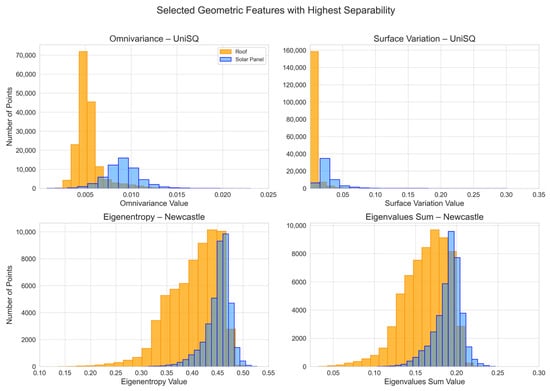 The features that demonstrated the most effective separation between roof and solar panel classes, based on low histogram overlap (≤0.2) and high KL divergence (≥1), were omnivariance, anisotropy, surface variation, and sphericity. Surface variation recorded the highest KL divergence in both directions, showing the greatest difference between the two classes.