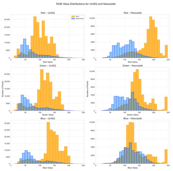 The UniSQ dataset, with clear panel definition achieved through RANSAC, demonstrated excellent performance with minimal reliance on RGB features. Comparatively, the Newcastle dataset had a greater variety of rooftop structures and solar panel arrangements that showed greater dependency on spectral attributes, especially red and green channels. Where geometric feature separation was weaker, these spectral inputs effectively supplemented the model’s ability to distinguish panels from roofs.