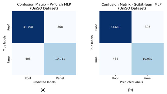 Confusion matrices for PyTorch (a) and Scikit-learn (b) classifiers on the UniSQ test set. Performance metrics are provided in Table 5.