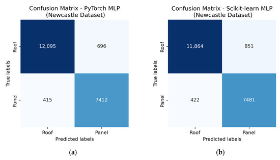 The confusion matrices shown in Figure 10 show classifier performance across the two classes, roof (class 0) and solar panel (class 1), using the TP, TN, FP, and FN definitions. Both models performed similarly overall, with very close false negative counts. PyTorch achieved fewer false positives, notably for roof classification. Although Scikit-learn showed a high number of correctly classified panel points, this was due to a higher number of panel samples in the test set, caused by differences in how each model split data, even when using the same random seed. Overall, both models handled the dataset well and proved reliable.