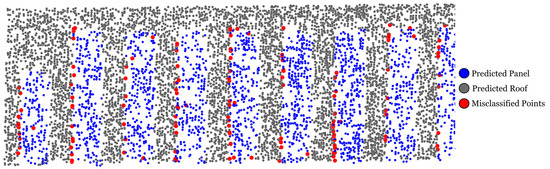 Figure 12 shows a section of roof from the UniSQ test set, where predicted panel and roof points are shown alongside misclassified points in red. These misclassified points generally cluster around the solar panel edges and roof transitions, consistent with the expectation that geometry is more ambiguous in these areas, which can reduce the reliability of geometric features such as omnivariance or surface variation. This visually reinforces how edge complexity and return inconsistency influence classification accuracy, even in a thoroughly labelled dataset.