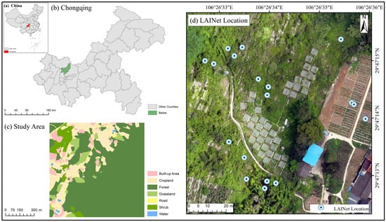 The study area is located at the Caoshang Remote Sensing Observation Station (29°47′14″N, 106°26′33″E) in Beibei District, Chongqing. Situated within the mountainous region of the eastern Sichuan parallel ridge-valley system, in the Zhongliangshan Longfeng trough valley area, this site represents a typical karst trough landform characterized by significant topographic relief, fragile ecosystems, and complex terrain. The area experiences a subtropical monsoon humid climate with frequent cloud cover and limited annual sunshine. The land surface composition primarily consists of exposed bedrock, natural vegetation, cultivated land, and buildings. Within a delineated 500 m × 500 m study plot (Figure 1), we implemented an improved Multi-scale Nested Sampling Methodology (MNSM) to establish 18 Elementary Sampling Units (ESUs) measuring 0.5 m × 0.5 m each. The ESU distribution comprised 3 cropland units, 3 forested units, 5 shrubland units, and 7 grassland units. Each ESU was instrumented with LAINet sensors (Beijing Star Viewer Science and Technology Ltd., Beijing, China)to systematically acquire LAI measurements across the Caoshang terrain.