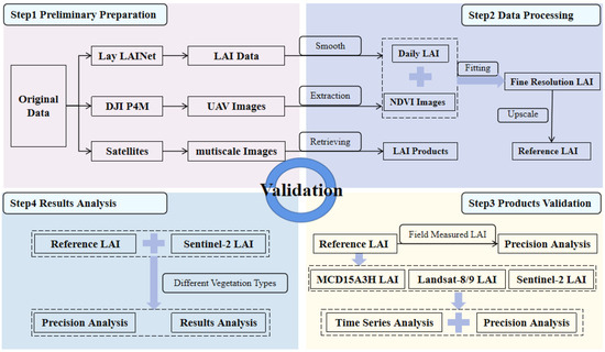 The Leaf Area Index (LAI) is defined as one half of the total green leaf area per unit ground surface area [1] and serves as a critical biophysical parameter for characterizing both the structure and growth vigor of terrestrial vegetation [2]. LAI is the primary biophysical variable governing the exchanges of carbon dioxide, water vapor, and energy between terrestrial ecosystems and the atmosphere [3,4]. As leaves constitute the primary functional units of plant canopies, the LAI directly governs the capture and utilization of solar radiation; thereby, it is closely linked to carbon cycling, leaf respiration, transpiration, and photosynthesis. It is consequently recognized as the pivotal parameter in terrestrial ecosystem models [5,6]. Existing global LAI remote sensing products with varying spatiotemporal resolutions are derived through different retrieval algorithms. These products have significant applications across multiple domains including ecophysiology, atmosphere–ecosystem interactions, and global change studies [7]. Currently, numerous LAI products have been generated worldwide. Notably, NASA has produced the LAI product series based on MODIS sensor data (2000–present). The European Space Agency (ESA) has released multiple generations of global LAI products (including CYCLOPES, GEOV1, and GEOV2) derived from SPOT/VEGETATION data. Additionally, China has developed domestic LAI products such as GLOBALBNU and MusyQ, further enriching the global LAI product inventory. In the domain of LAI products, China domestically developed an LAI product series (e.g., GLOBALBNU and MusyQ) which have achieved significant advances in both algorithm innovation and validation accuracy. These products have undergone continuous evaluation through global, distributed validation networks (e.g., VALERI, BELMANIP2), providing a scientific basis for product selection across different application scenarios. While these data products establish a fundamental basis for researchers to better analyze our living planet, most remote sensing products are generated at a global scale with spatial resolutions ranging from hundreds of meters to kilometers, making them inadequate for precisely characterizing the detailed features of heterogeneous land surfaces. In areas with heterogeneous surfaces, particularly in fragmented vegetation or ecotone zones, mixed-pixel effects become pronounced, directly compromising the spatial representativeness and retrieval accuracy of the products. Therefore, systematic validation must be conducted prior to the regional or local applications of these remote sensing products to quantitatively assess their accuracy and delineate applicable domains and uncertainty sources.