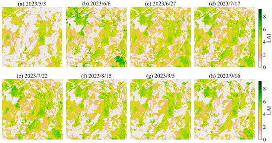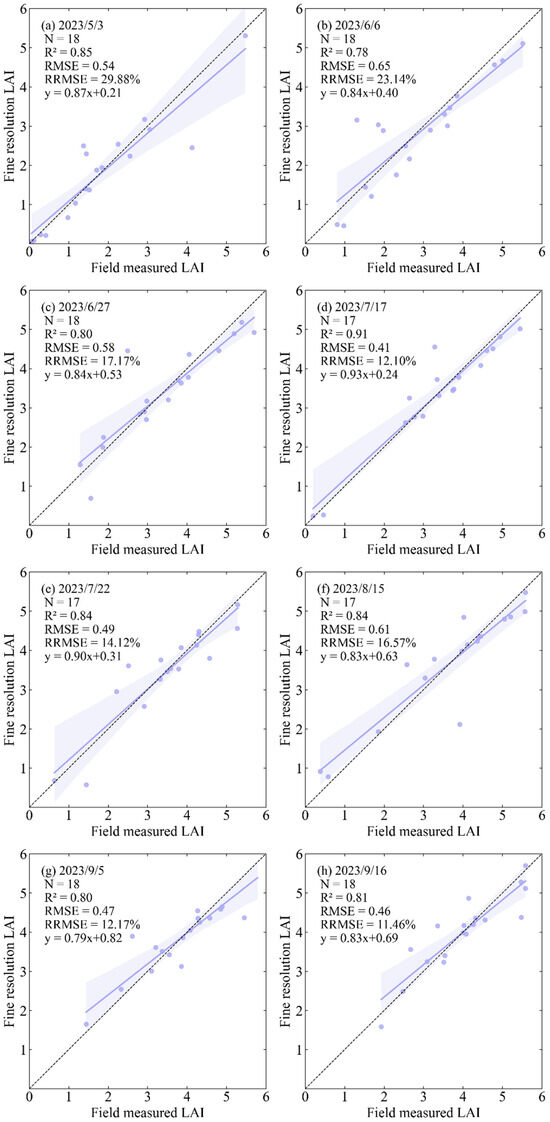 Primary error sources of LAI remote sensing products originate from retrieval model errors, input data inaccuracies, scale effects, and ill-posed inversion problems, along with other contributing factors. To quantify the errors introduced by the retrieval model, this study used field-measured LAI measurements to validate fine-resolution LAI maps, and eight fine-resolution LAI maps of the study area were generated through NDVI-LAI model inversion using the equation with minimal root mean square error (RMSE), as shown in Figure 3.