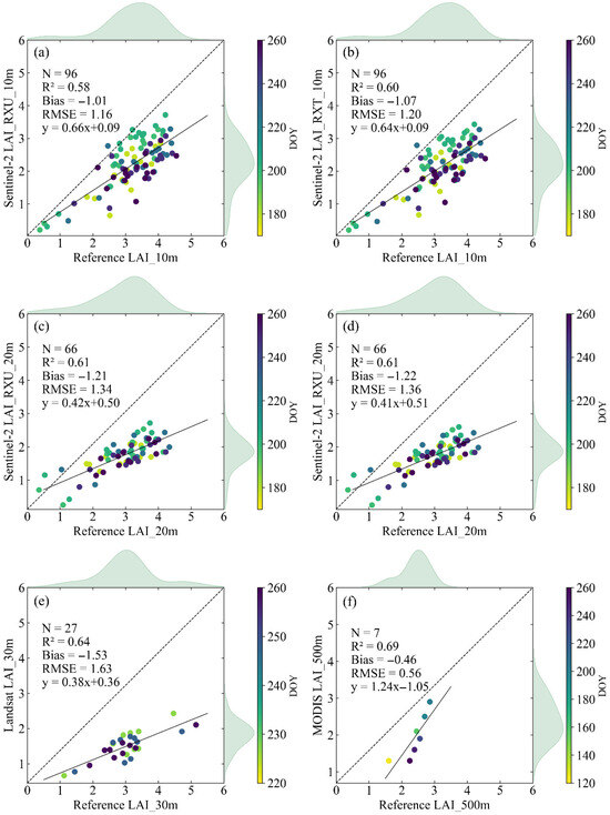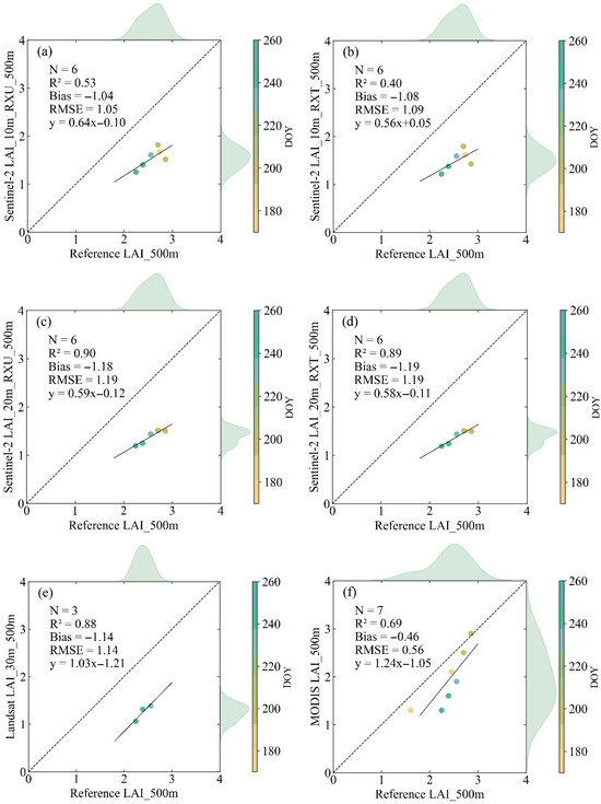 Comparison of the LAI products with the 500 m daily reference LAI in the study area. (a) Sentinel-2 LAI_10m_RXU_500m; (b) Sentinel-2 LAI_10m _10m_RXT_500m; (c) Sentinel-2 LAI_20m_RXU_500m; (d) Sentinel-2 LAI_20m_RXT_500m; (e) Landsat LAI_30m_500m; (f) MODIS LAI_500m.
