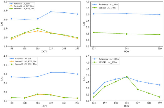 Figure 7 presents the temporal comparison results between the validated products in this study and the corresponding reference LAI maps at their respective spatial scales. As shown in panel (a), the Sentinel-2 LAI_10m product exhibited a negative correlation with the reference values before DOY 227, followed by a synchronous declining trend in both datasets, with a correlation coefficient (R) reaching 0.99. Overall, the Sentinel-2 LAI_RXU_10m product consistently yielded higher values than Sentinel-2 LAI_RXT_10m across all observation periods. Panel (b) shows that the Sentinel-2 LAI_20m product exhibits good consistency with the reference values, but there is a more significant underestimation overall. Panel (c) demonstrates that the Landsat LAI_30m product follows the same trend as the reference values, but its RMSE is 1.53, indicating lower accuracy compared to the Sentinel-2 LAI products. The MODIS LAI product shows the best consistency with the reference values among the other products, with a correlation coefficient (R) of 0.83. However, previous studies have shown that MODIS LAI products tend to underestimate crop LAI at the end of the growing season [54]. As shown in panel (d), the MODIS LAI severely underestimates LAI values, especially after DOY 203, where the bias is −0.80, compared to −0.21 before DOY 203.