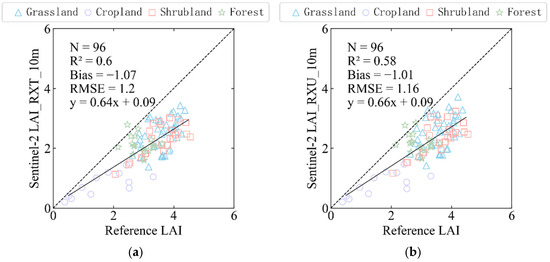 Validation results of Sentinel-2 LAI_10m products of different vegetation types. (a) Sentinel-2 LAI_RXT_10m; (b) Sentinel-2 LAI_RXU_10m.