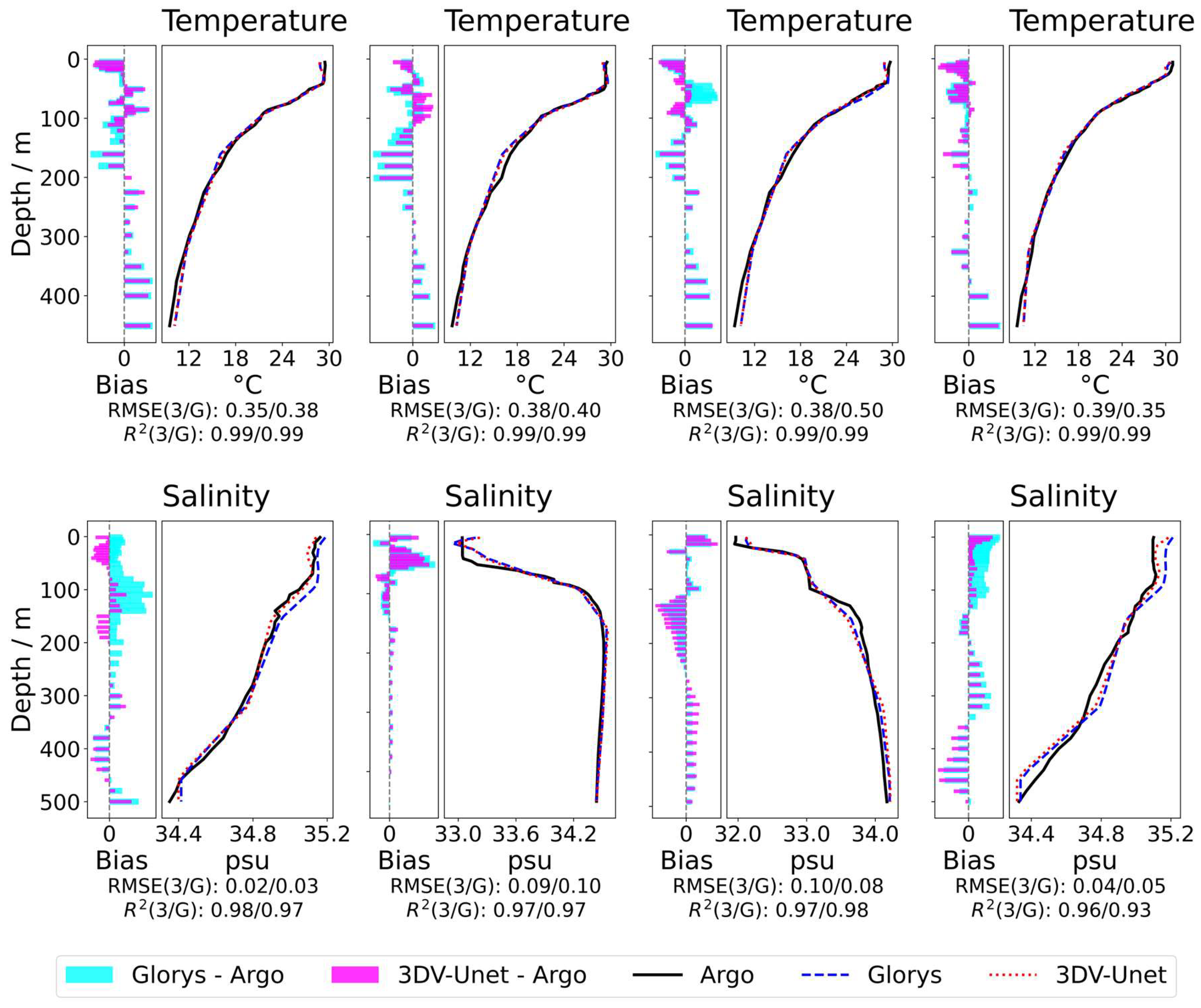 Region | Source | R2 (Temp) | RMSE (Temp) | R2 (Salinity) | RMSE (Salinity) |