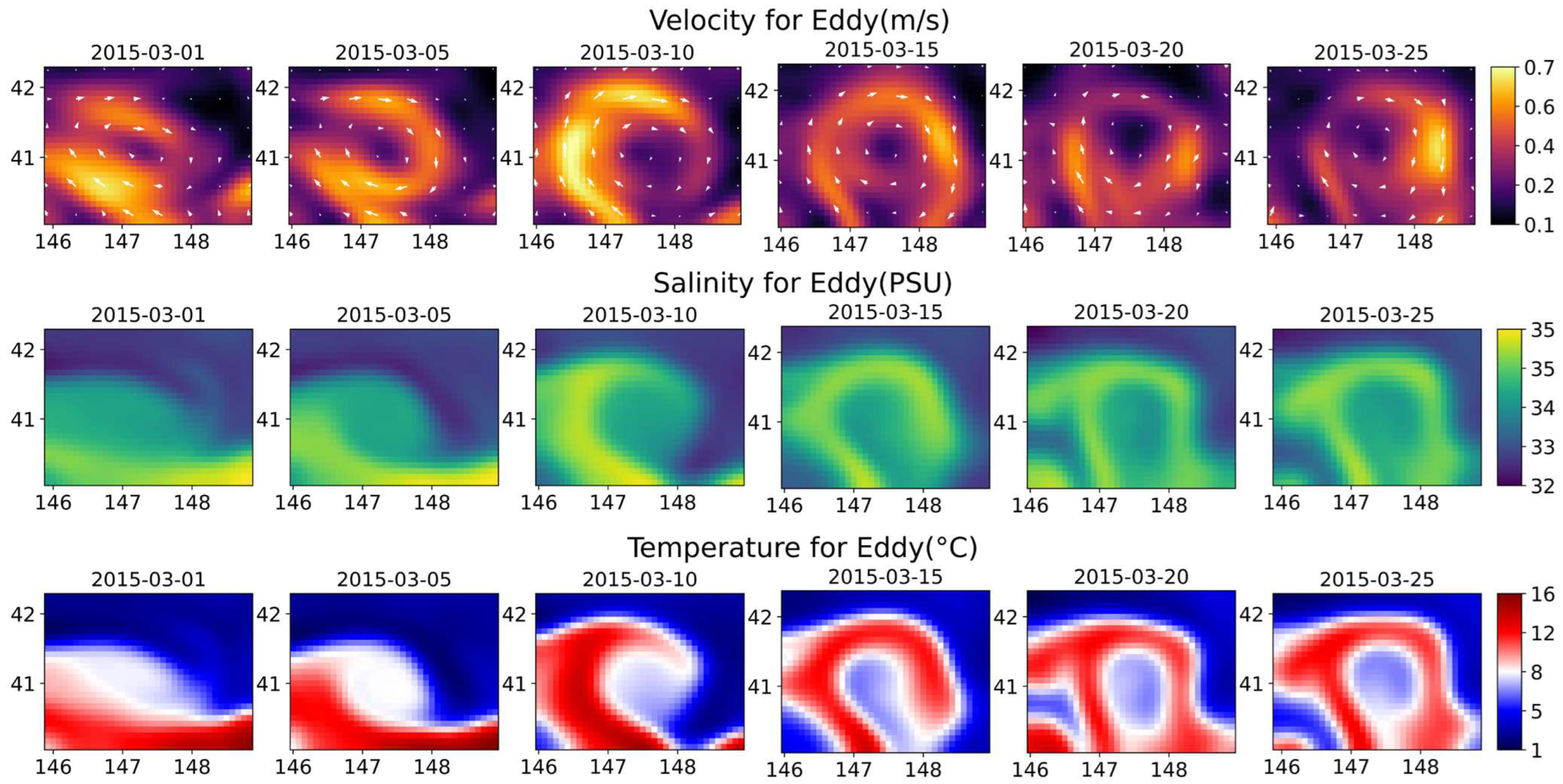 - Zhang, L.; Ma, X.; Wan, X.; Weishuai, X.; Sun, X. Three-Dimensional Thermohaline Reconstruction of Mesoscale Eddies under Remote Sensing Observation: From the Perspective of Deep Learning of Layer Depth Sequences with Fusion of Physical Mechanisms. J. Sea Res. 2025, 205, 102593. [Google Scholar] [CrossRef]