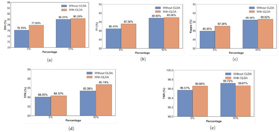 Effectiveness of channel-level data augmentation in our proposed method. (a) IoU, (change) (b) F1, (c) Kappa, (d) TPR, (e) TNR.