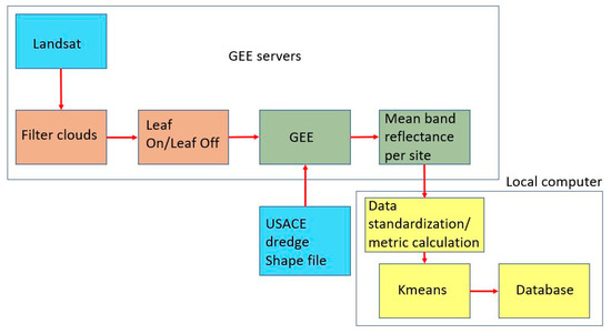 K-means, a machine learning (ML) approach, was applied to detect exposed dredged sediments due to its ability to analyze large datasets rapidly and consistently. As an initial step, a GEE script was built to present a researcher with preprocessed imagery, with clouds removed and composited into leaf-on and leaf-off images, and have the researcher visually verify the existence of exposed sediments. Twenty-nine locations for training and a separate twenty-nine locations for testing were selected. For each location, the researcher observed the Landsat imagery for each leaf-on and leaf-off image and manually identified if exposed sediments were present. The tabular data extracted from GEE were then standardized and additional metrics were calculated, including moving window means, standard deviation, and the minimum and maximum for each individual band, in addition to deviation from the mean for the blue, green, and red bands and separately for the NIR band. When dredge sediments were present, an inverse relationship was observed between the green band compared to the blue, red, and NIR bands. The mean of the blue, red, and NIR bands were subtracted from the green band to give a “difference” value. The absolute value of the standardized mean of the blue, red, and NIR bands was subtracted from the standardized absolute value of the green band to obtain a “bias” value. These metrics were all fed in as parameters to the different models, resulting in 30 input variables (‘blue’, ‘green’, ‘red’, ‘NIR’, ‘rolling mean for each band’, ‘rolling std for each band’, ‘rolling max for each band’, ‘rolling min for each band’, ‘range’, ‘difference from mean for each band’, ‘difference from the mean, green and red bands’ and ‘absolute difference from the mean, green and red bands’). Figure 1 is a conceptual model that depicts the image processing in GEE and machine learning analyses in python.