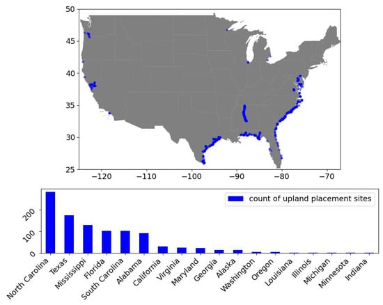 A map of the United States showing the locations of all 1048 active upland dredged sediment placements. The plot below the map shows the number of sites within each state with a recorded active dredged placement site.