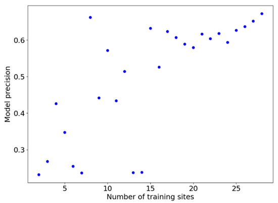 A plot of model precision vs. number of training sites. The model showed good improvement with larger training datasets and continued to improve above 25 training sites.