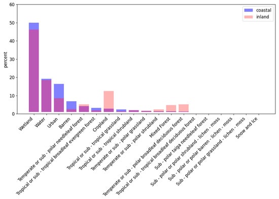 A plot of the dominant classes within 1 km of coastal and inland active upland placement sites. The percent of each class is calculated based on the total for all classes for inland and coastal separately based on land area. NB: the Water class pertains only to freshwater.