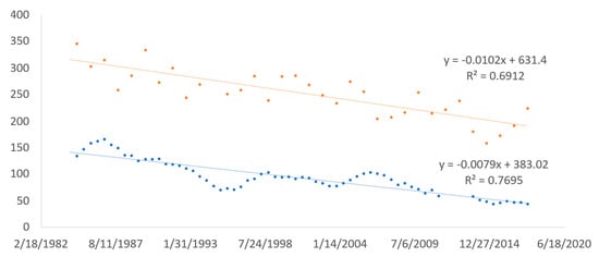 Locations with near-continuously exposed sediments were removed from analysis. Manual observation showed these locations were intensively used as sediment placement sites and were never able to re-vegetate. The NESSI model was unable to distinguish individual placement events, as it uses the time from first detected sediment placement to mark the start of an event. Essentially these high activity zones are classified as a single dredge placement event that lasted 50 years. However, we were able to manually observe that multiple individual placement events took place within the 50 years. With the outliers removed, the count of placement sites with detected exposed sediment declined over time. This decline agrees with the reduction in the combined USACE contracted and internal dredging volume [15,16] (Figure 6). When regressed against one another, the relationship exhibits an r-squared value of 0.54. The agreement between the USACE dredged volume data and NESSI shows that the model has the capability to detect long-term trends in dredging activity. NESSI tracks only upland sediment placement, which accounts for 11% of total dredged material placement activity, meaning other placement methods are not considered.