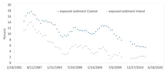 In addition to being the more numerically dominant category, coastal sites were also more frequently disturbed, with 10.1% of sites having exposed sediments on average compared to 6.3% inland sites. Figure 7 shows that this difference was relatively consistent over time, with inland locations demonstrating a lower proportion of disturbance than coastal sites by percent. The difference between coastal and inland sites is attributed predominantly to site recovery time.
