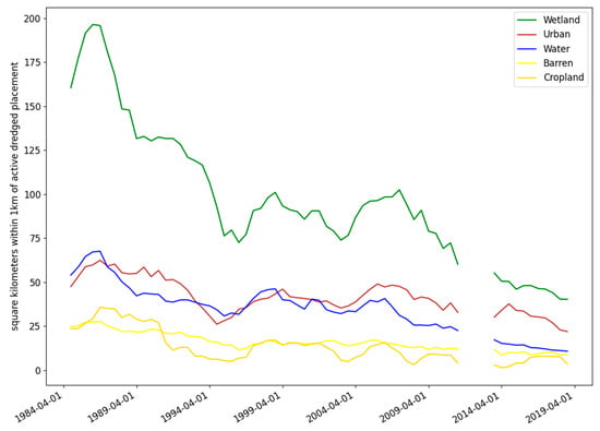 Landcover classes within 1 km of the dredged sediment placement were selected to investigate the core landcover classes that are likely to be impacted by sediment placement activity. This analysis showed that the decline in dredging activity was disproportionally divided between the separate landcover classes (Figure 8). While there was an overall decline in sediment placement, wetlands experienced the largest reduction in activity, with approximately 3.74 fewer km2 disturbed annually. Of the top five most common classes within 1 km of placements, urban and cropland landcover classes have had the slowest decline in impact, with an annual reduction of 0.74 (urban) and 0.72 (cropland) km2 disturbed annually.