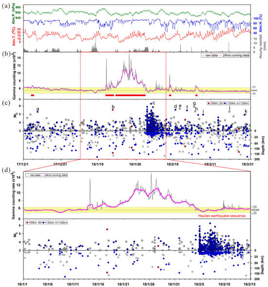 The temporal variations, from 1 December 2017, to 31 March 2018, are displayed for the meteorological data (a), including atmospheric pressure (green), humidity (blue), temperature (red), and hourly rainfall (black); the gamma-rays (b) where purple lines indicate the 24 h running averages of gamma-ray data, grey lines represent the raw data, horizontal dashed lines indicate the annual averages of the observed results, and the anomalous threshold value (±2σ) is shown with the yellow bar; and the magnitude and depth of earthquakes (c) are designated by circle symbols in different colors, denoting the epicenter distance to the YMSG station (i.e., red for <50 km, blue for 50 to 130 km, and grey for >130 km). A zoomed time period (d) from 1 January to 14 February 2018, exhibits more details about the gamma-rays and earthquake activity.