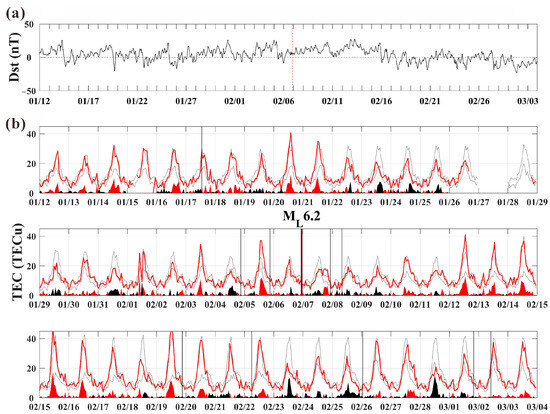 (a) Dst index and (b) The TEC variation at 24.0°N and 121.5°E from 25 days before to 25 days after the ML6.2 Hualien earthquake. The red curve is the hourly observed TEC, the two gray curves are the associated UB and LB bounds. The red/black shadow denotes the absolute value of deviations for those observed TEC higher (red) than UB or lower (black) than LB bounds.