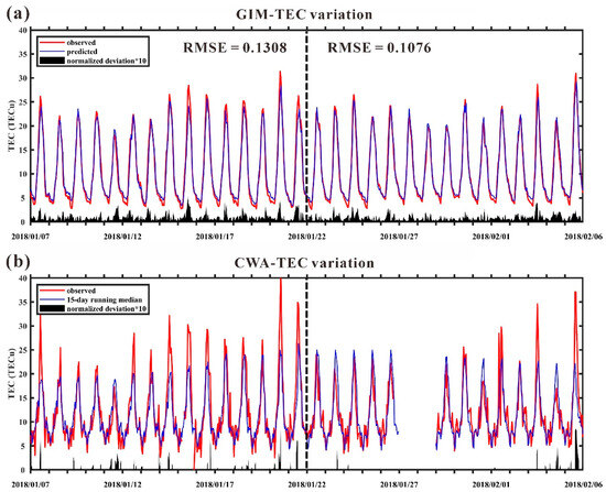 Thirty days of TEC variations before the ML6.2 Hualien earthquake. (a) The GIM-TEC variations, from 7 January to 5 February 2018, where the red line denotes the observed TEC and the blue one designates the predicted TEC from the trained model. The black shadow denotes the absolute value of the normalized deviations between the observed GIM-TEC and predicted TEC. The root mean square error (RMSE) for the period from 7 January to 22 January and 22 January to 5 February is 0.1308 and 0.1076, respectively. (b) The CWA-TEC variations from 7 January to 5 February 2018. The red line denotes the observed TEC from CWA data. The blue line denotes the previous 15 days running median of the CWA-TEC data. The black shadow denotes the absolute value of the normalized deviations between the observed CWA-TEC and the running median TEC.