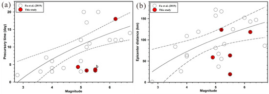 The variation diagrams illustrate the relationship between the magnitude of the precursory event and (a) the distribution of precursory time and (b) epicenter distance from the YMSG station. The red circles represent the findings of this study. The fitted curves are shown as solid lines, with dashed lines representing the 95% confidence interval of the dataset, and hollow circles correspond to the data from Fu et al. [49].