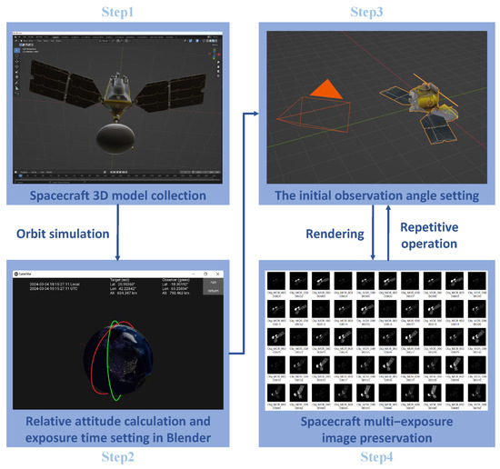 Due to the difficulty of obtaining actual observation images of spacecraft, most image datasets are generated through software rendering or semi-physical simulation, such as the BUAA-SID dataset [24] and the SPEED+ dataset [25]. However, existing simulation datasets do not consider space-based imaging scenarios of spacecraft with the specific photographic technique called exposure bracketing performed during the orbital rendezvous. At the same time, there are changes in the illumination condition of the observed target in different regions of the orbit, as well as differences in the reflectivity of its various components. Therefore, we used Blender to create a multi-exposure image dataset of spacecraft observed during orbit intersection. The simulation steps for generating spacecraft images are shown in Figure 3.