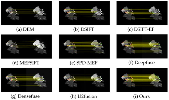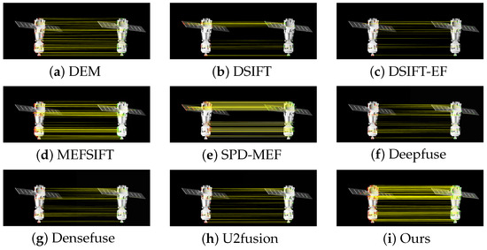 Figure 6 and Figure 7 illustrate the fusion results and SIFT feature point extraction effects of the proposed method alongside comparative methods on the test set of the MES dataset. As shown in Figure 6, the fusion results of all the compared methods except for SPD-MEF and our method exhibit significant artifacts along the edges and critical regions of the sailboard. However, the fusion result of SPD-MEF has uneven and discontinuous brightness changes at both the sailboard and the main body of the spacecraft. In comparison, our result retains high contrast and texture details. As shown in Figure 7, compared with the other methods, our method can obtain a better feature matching result, especially in the outer sailboard where the relative attitude changes max. Moreover, it is capable of extracting a greater number of feature points while preserving the subjective visual effect, and performs better in the computer processing of subsequent IOS tasks.