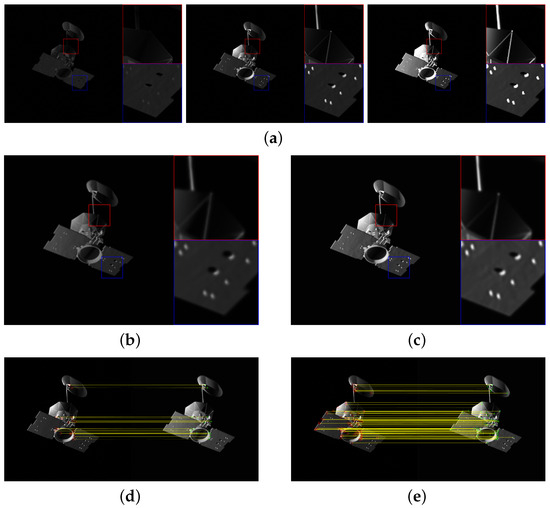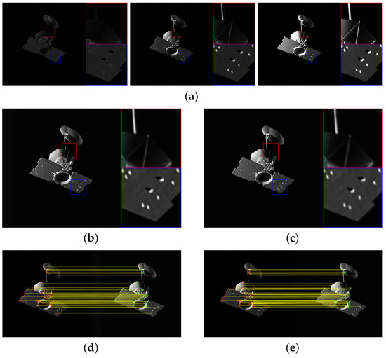 When dealing with spacecraft images, traditional dynamic methods based on eliminating motion pixels have difficulty handling complex overlapping regions of the target, which may lead to loss of valid information [8,9]. Furthermore, some subsequent tasks in the IOS system possess certain particularities, such as three-dimensional reconstruction and attitude estimation. These are highly sensitive to variations in the multi-view geometric relationships of the observed target, while traditional registration-based methods are prone to causing changes in the shape of the observed targets (the corner of the solar panel, etc.) [10,11,12].