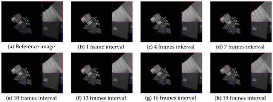 To explore the limitations of our method, we conducted fusion tests using non-adjacent image frames. The specific settings of the experiment were as follows. First, we took an image with middle exposure duration, denoted as , from the kth multi-exposure image set of an observation sequence as the reference image, where . Next, we respectively took i groups of low-exposure-time images and high-exposure-time images for fusion with . In this way, we obtained comparison groups, with the differences in the number of adjacent frames between comparison groups being respectively. In order to retain a sufficient number of comparison groups, we set during the test. As a result, we obtained 896 groups of limitation test data for our subjective and objective analyses.