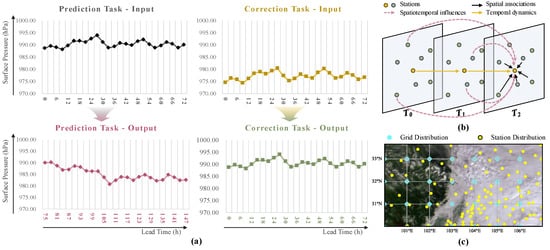 Motivation for the new techniques in DRAF-Net. (a) Input and output in prediction and correction tasks, illustrated with surface pressure from a single station. In prediction, the input and output are 147 h of continuous station observations. In correction, the input is 72 h of station-level predictions, with the output being the corresponding observations, highlighting the clear similarity between the two. (b) Dependencies in station-level NWP data: Temporal dynamics (dependency within the same station over time, such as temperature variation), spatial associations (dependency across stations at the same time, such as pressure patterns), and spatiotemporal influences (cross-time and cross-station dependencies, such as wind movement over time and space). (c) Distribution comparison between regular grids and irregular stations, with the background showing the satellite cloud image of the region.