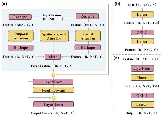 To compute attention across different views, we adjust the feature shape to direct the model’s attention focus, as shown in Figure 3a. First, we retain the feature shape as  for spatiotemporal attention. In this view, the model can explore global relationships among all features, capturing cross-spatiotemporal influences among the stations. Next, we decouple the features along the temporal and spatial dimensions to compute attention in the temporal and spatial views separately. For the temporal view, we merge the N dimension into B, resulting in a feature shape of . This enables the model to capture dynamic patterns in meteorological states at each station over time, enhancing its ability to adjust for variations along the temporal dimension. For the spatial view, by merging the T dimension into B, we obtain a feature shape of . This allows the model to focus on feature relationships among different spatial locations at a single time step, capturing spatial dependencies among stations and thereby improving its correction capability for anomalies in the spatial dimension. Finally, we fuse the results from these three perspectives to create a comprehensive feature representation that integrates both global spatiotemporal dependencies and localized temporal and spatial relationships. The fused feature  is computed as follows: