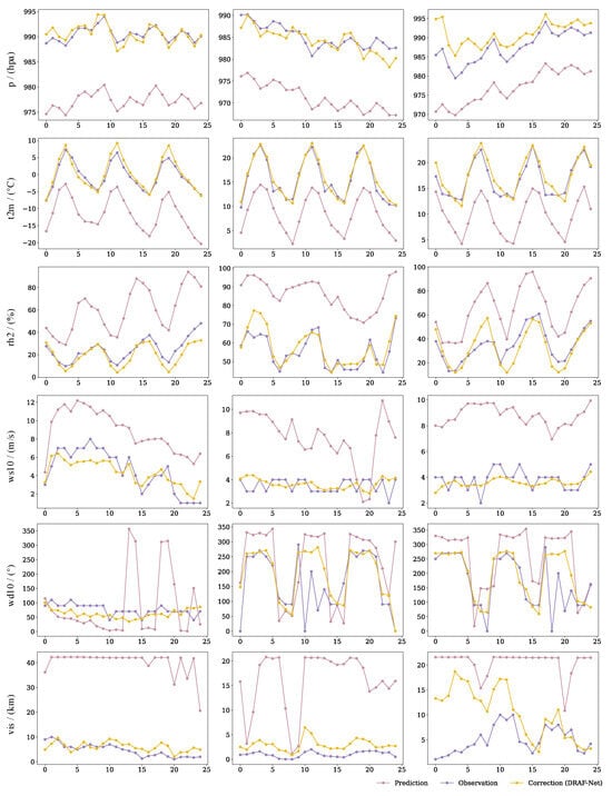 Visualization of observations, predictions, and DRAF-Net corrections for three representative stations selected for each common meteorological variable (p, t2m, rh2, ws10, wd10, and vis) from the first dataset, spanning 25 consecutive time steps.