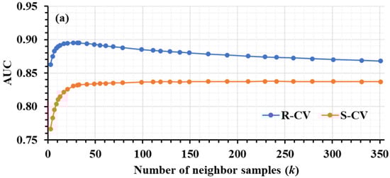 The search spaces and optimal values of the hyperparameters of different ML models are given in Table 3. The LDA and LR have not been included in this section, as these models do not require hyperparameter tuning. Figure 4a–e displays the AUC of the ML models across different hyperparameter values obtained using R-CV and S-CV. Figure 4a shows the AUC values of KNN using R-CV and S-CV. The R-CV identified a smaller k (i.e., 27) whereas S-CV preferred a large k value (i.e., 241) to achieve optimal performance in predicting landslide and non-landslide areas. For the SVM, R-CV and S-CV identified 0.0234 and 0.0135 as optimal gamma values, respectively, and the same cost value (i.e., 5) to achieve the best result (Figure 4b). For ANN, the R-CV and S-CV identified the same size and decay values (i.e., 1 and 0.01, respectively) as optimal to obtain maximum accuracy (Figure 4c). For the RF, the optimal value of mtry was identified as 1 and 5 using R-CV and S-CV, respectively (Figure 4c). However, it should be noted that the RF did not show a noticeable impact of mtry on model accuracy, irrespective of the CV methods used in the performance assessment. R-CV and S-CV identified the same number of trials (i.e., 90) as optimal for C 5.0 (Figure 4e).