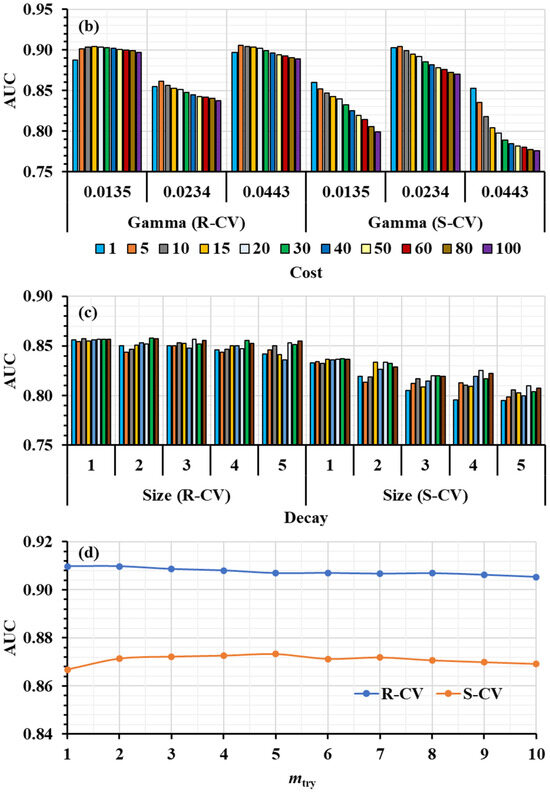 R-CV and S-CV showed differing degrees of the sensitivity of ML performance to the selected hyperparameter values, particularly for the SVM and ANN models. For SVM, R-CV tuning implies that gamma is a more crucial hyperparameter than cost, whereas S-CV indicated both as crucial hyperparameters in obtaining accurate results. Similarly, based on the R-CV tuning of ANN, one would have an impression that decay is relatively more important than size, whereas S-CV indicates that both are crucial hyperparameters for obtaining accurate results. It is worth noting that in all the ML models, R-CV-based hyperparameter selection produced noticeably higher AUC values than did S-CV, indicating an overly optimistic performance estimation. The RF model demonstrated the least sensitivity to the hyperparameters as compared to other ML models (irrespective of the CV methods considered).