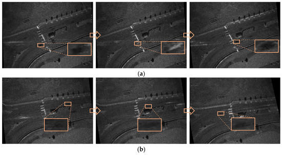 Synthetic aperture radar (SAR) is a sophisticated remote sensing instrument for Earth observation. Unlike optical sensors, SAR operates based on active microwaves, and enables continuous operation under all weather conditions and time ranges [1,2,3,4,5,6]. Consequently, SAR has been extensively adopted in civilian domains such as marine detection, forest inventory, geological mapping, land surveying, and traffic management, as well as in military applications, including battlefield scout, combat monitoring, radar-homing operation, and post-strike assessment [7,8,9,10,11,12]. Video SAR delivers successive SAR image sequences of a target area, enabling real-time dynamic scene monitoring. This feature captures temporal changes in the target region, presenting information visually in a dynamic image form that aids direct human interpretation [13]. As a result, video SAR has garnered significant interest among researchers [14,15,16].