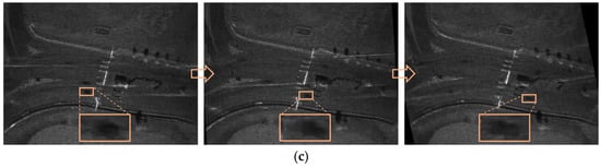 The publicly available Sandia National Laboratories (SNL) dataset [50] is employed in our paper, which features ground-moving vehicles for video SAR shadow detection. The airborne imaging platform operates at an altitude of 2 km and travels at a speed of 245 km/h, achieving a cross-range resolution of 0.1 m and using the wavelength of 1.8 cm. The platform’s electromagnetic band is in the Ku-band with a center frequency of 16.7 GHz, using the spotlight imaging mode. The total imaging duration is 232 s, the incidence angle is 65°, and the total rotation angle is 200°. The SNL dataset contains 900 video frames, each with an image resolution of 660 × 720 pixels. For training and validation, the dataset is split at a 2:1 ratio.