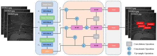MambaShadowDet is designed based on the advanced one-stage detector, i.e., YOLOv8. YOLOv8 is a real-time object detection algorithm released on the Ultralytics website in 2023, which has advantages of high efficiency and high accuracy due to its tiny model size and its powerful network structure. Thus, we chose YOLOv8 as our baseline. Figure 2 shows the network architecture of MambaShadowDet.