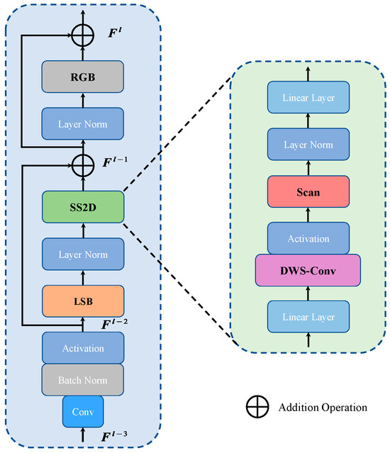 where and represent the input and output feature maps, respectively, while LSB and RGB represent the local-spatial block (LSB) and residual-gated block (RGB). The network architecture of the SSM-Block can be seen in Figure 3. The intermediate state, is produced after SS2D [48]. The SS2D, out of SSM-based architectures, enables modeling long-range relations and extracting global context information, the LSB, out of CNN-based architectures, enables extracting local spatial information, while the RGB, out of CNN-based architectures, enables enriching the local dependency relationship. Last but not least, the processing mechanism and the detailed structure of SS2D, LSB, and RGB can be seen in Section 2.3.1, Section 2.3.2, and Section 2.3.3.