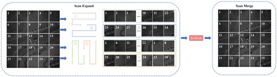 The SS2D algorithm [48] is a convolution-liked operation based on SSM; it consists of three primary steps: scan expansion, S6-Block, and scan merge, with the overall process depicted in Figure 4. The scan expansion step divides the input video SAR image into a set of sub-images, each aligned with a specific orientation. From a diagonal perspective, the operation is performed along four symmetrical orientations: left-to-right, right-to-left, top-down, and bottom-up. This structure includes all video SAR image regions and enriches multi-dimension feature information, facilitating the subsequent backbone feature extraction. Next, these sub-images undergo refining features by the S6-Block [49,54], and finally, the scan merge step combines the above sub-images to create a synthetic image with the same dimensions as the input video SAR image. The main function of SS2D is to extend the learnable range of the model without increasing the amount of computation, thus improving the shadow detection performance of the model.