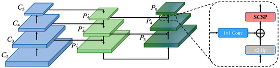 Slim-PAFPN composed of PAFPN with SCSP. The network architecture of Slim-PAFPN is shown in Figure 7. On the one hand, the PAFPN adds a bottom-up path based on the Feature Pyramid Network (FPN), which enables high-level features to better integrate the detailed spatial information of low-level features. Traditional FPNs mainly rely on top-down paths for feature fusion, which may result in the loss of spatial information details in high-level features. The PAFPN effectively transfers the detailed spatial information of low-level features to high-level features through a bottom-up path, thereby enhancing the reliability and accuracy of contextual information representations. On the other hand, the SCSP module adopts the design concept of a cross-stage partial network (CSP) and combines the advantages of depth-wise separable convolution and channel shuffle. Specifically, it first divides the feature map into two equal parts in the channel dimension. Then, a reduction in computational complexity is achieved through the depth-wise separable layer, and the non-linear expression ability is enhanced through the channel shuffle layer. Thus, when the raw feature fusion module in the PAFPN is replaced by SCSP, SCSP can effectively fuse the feature maps of different stages with lower computational cost. In short, the neck, Slim-PAFPN, composed FAFPN with SCSP is able to further reduce model complexity while improving the multi-level feature extraction ability of the model.