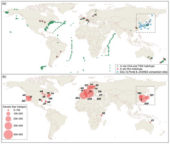 Global distribution of matchups between validation datasets and GCOM-C/SGLI. (a) Locations of 331 in situ  matchups (red cross), 753 in situ Chla and TSM matchups (green circle) of cruise measurements, and 22 sites for G-Portal and JASMES comparison (blue cross). (b) Distribution of 3704 AERONET-OC matchups, with red circles indicating locations and sizes proportional to the number of measurements at each site. The dashed box represents the footprint of the JASMES full-resolution  product over Japan.