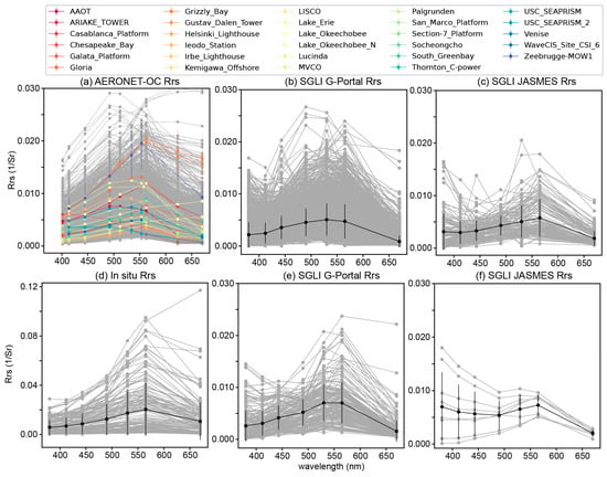 Comparison of  spectra for various matchup scenarios. The first row represents  spectra for matchups between (a) AERONET-OC and both (b) SGLI G-Portal and (c) SGLI JASMES. The second row shows  spectra for matchups between (d) cruise measurements and both (e) SGLI G-Portal and (f) SGLI JASMES. Grey lines represent individual matchups, with black lines indicating the mean  values across different wavelengths. The legend at the top identifies the mean  values at various AERONET-OC sites, as shown in panel (a).