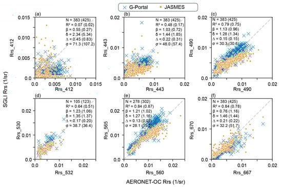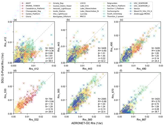Scatterplots (a–f) comparing AERONET-OC  values with SGLI G-Portal  values at 29 AERONET-OC sites, covering z global scale. N refers to the number of matchups, R2 to the coefficient of determination, β to bias, δ to mean absolute difference, ∆ to root mean square difference, and σ to mean absolute percentage difference in percent (%). The dashed grey line represents the 1:1 line.