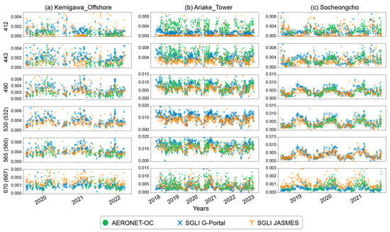 Figure 6 presents time series plots of  values at SGLI bands for three AERONET-OC sites: Kemigawa_Offshore, Ariake_Tower, and Socheongcho. The discrepancies between AERONET-OC and both G-Portal and JASMES are more pronounced at shorter wavelengths (412 nm and 443 nm) across the three sites. SGLI G-Portal aligns with AERONET-OC data better than JASMES at these shorter wavelengths. Both G-Portal and JASMES show improved agreement with AERONET-OC data at longer wavelengths (530 nm, 565 nm, and 670 nm), exhibiting tighter clustering around the AERONET-OC values. The tendency of JASMES to underestimate  values is prominent, particularly at the 412 band. The systematic underestimation of  values by JASMES diminishes at longer wavelengths, showing better alignment up to the 565 nm band. However, this changes to an overestimation trend at 670 nm, particularly at the Kemigawa_Offshore and Socheongcho sites (Figure 6).