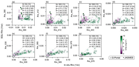Scatterplots (a–g) compare cruise  with SGLI  of G-Portal (x symbols) and JASMES (• symbols). The number of matchups (N), coefficient of determination (R2), bias (β), mean absolute difference (δ), root mean square difference (∆), mean absolute percentage difference (σ) in percent (%), and chlorophyll-a (Chla) are shown. For each wavelength, the metrics for G-Portal are listed first, followed by those for JASMES in parentheses. The dashed grey line represents the 1:1 line.