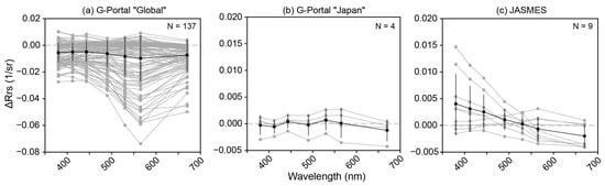 Difference in  values (Δ) between cruise measurement and SGLI of (a) G-Portal globally, (b) G-Portal over Japan, and (c) JASMES. N refers to the number of matchups. Each grey line represents individual observations, while the black line indicates the mean Δ, and the vertical bars represent the standard deviation of Δ at each wavelength.