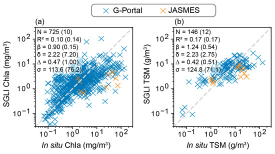 Scatterplots comparing in situ measurements and SGLI-derived values from G-Portal and JASMES for two products: (a) Chla and (b) TSM. The number of matchups (N), coefficient of determination (R2), bias (β), mean absolute difference (δ), root mean square difference (∆), and mean absolute percentage difference (σ) in percent (%) are shown. The metrics for G-Portal are listed first, followed by those for JASMES in parentheses. The dashed grey line represents the 1:1 line.