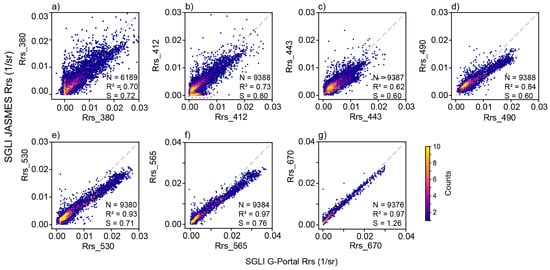 Density scatterplots (a–g) illustrate SGLI G-Portal  versus SGLI JASMES  over 22 sites (blue cross, Figure 1a). N refers to the number of matchups, while R2 and S denote the coefficient of determination and the slope, respectively. The dashed grey line represents the 1:1 line.